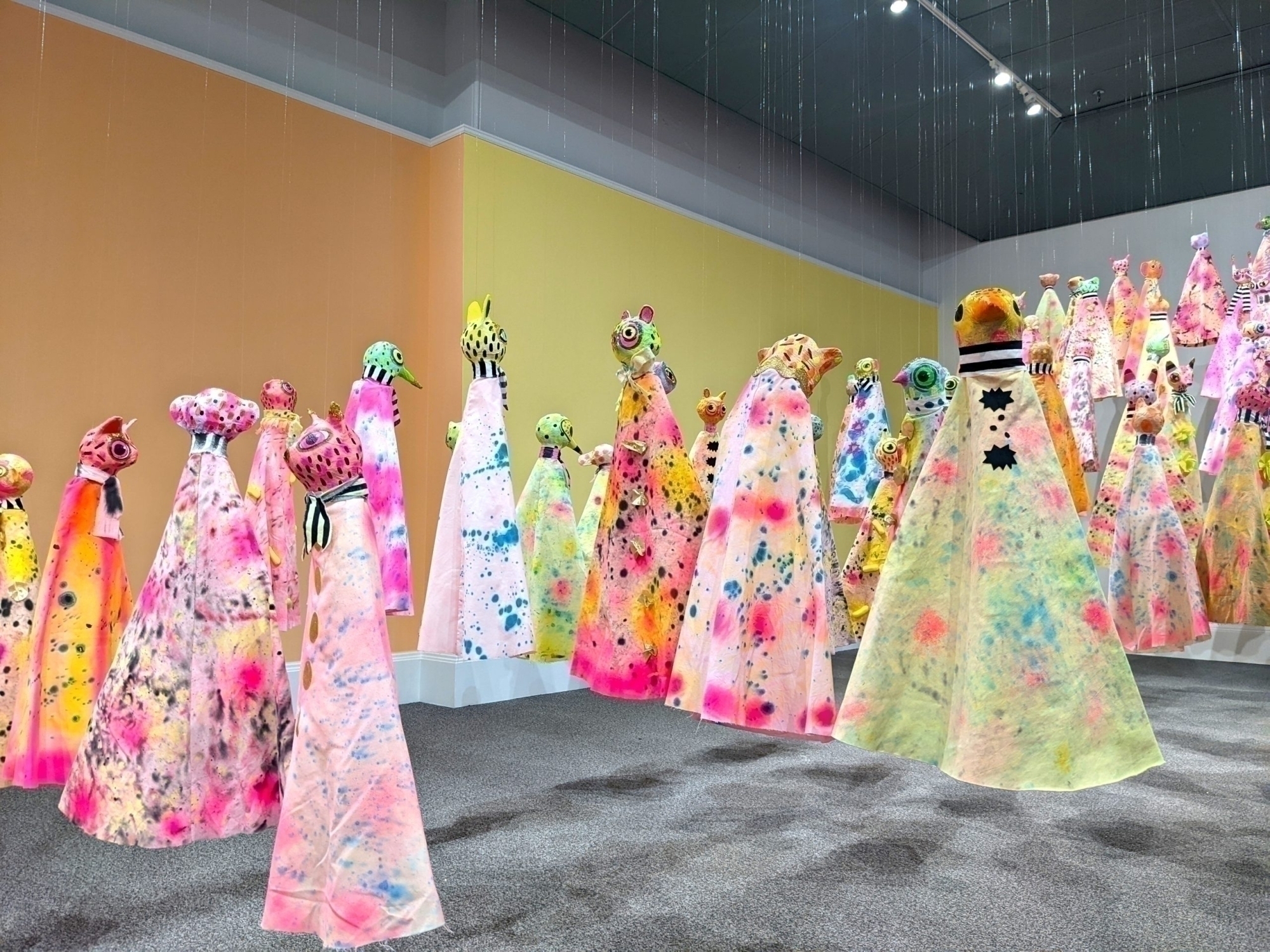They’re adorable, really, Kelly Kirkham’s creatures. With their big eyes and bright bodies, they look like they’ve stepped out of a storybook. In her installation for the Art Gallery of Northumberland they’re assembled for a carnival. Animal puppets descend from the ceiling, making their way towards a ring that contains what they’ve all come to see—a garden where strange figures romp over rocks and hide behind trees. They balance on slender legs, their feathered heads emerging from horse-like bodies. Big eyes stare out from mouthless faces. Is this a zoo? A circus? Are they performing or being? Three human-sized guardians watch over them, the hosts and directors of this enchanted scene. Swan, otter, and gazelle, they stand, heads slightly bowed, protecting their charges, keeping them contained. The sounds of a summer fair surround them. The walls are the colours of cotton candy. A child calls out in a voice full of delight.
